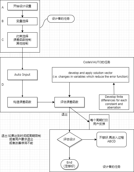 虽然您可以把AUTO当作一个黑匣子并得到设计结果, 但是了解其内在流程会有所裨益. 下面的框图表示了设计过程的一般流程, 包含AUTO管理的部分. 随着我们设置并运行一个例子,各个步骤的含义会更清楚. CodeV Reference Manual的第三章”Discussion of Input and Computations P352″详细讲述了自动设计,有助于理解AUTO的工作原理和过程.