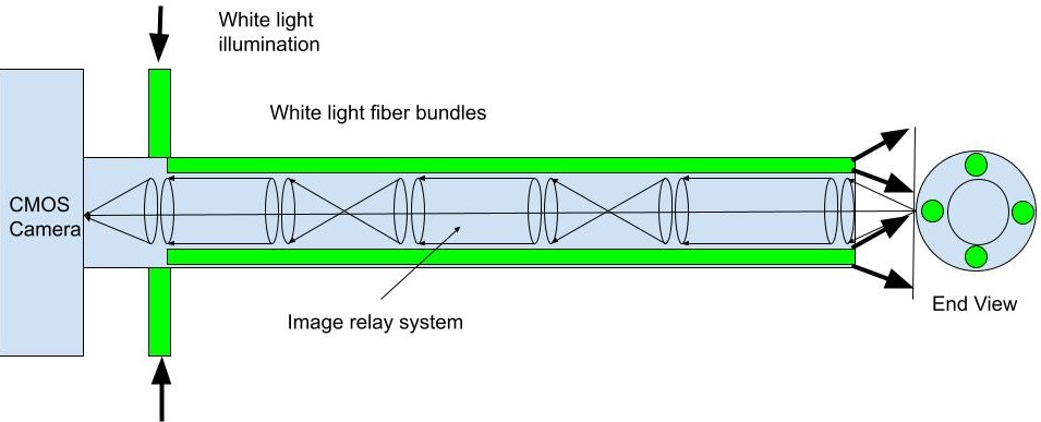 远端人体组织被成像到近端彩色CMOS相机上;当年mini相机的0.48M像素(800×600)在内窥镜成像系统中非常重要,现在的构想是2M像素(1600×1200).数值图像送到VR设备显示. Oculus Quest 1为PenTile OLED显示屏,单眼像素1440×1600, Oculus Quest 2为RGB-stripe LCD屏,单眼像素1832×1920, 双眼接近4K. 白光照明通过高亮度光源和光纤束投递,现在可以考虑多颗LED照明.