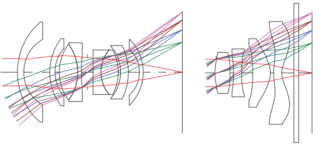 Fig.2(左)是35mm格式lens的典型结构. 镜头有如下基本光学特征:f’=28mm,F/#=2.8,DFOV=2*w=2*38°
