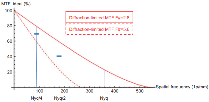Fig.3给出了孔径F/#=2.8(实线)和波长656nm(红线)衍射受限镜头的理想MTF. 蓝线给出空间频率Nyquist/2=180 lp/mm和yquist/4=90 lp/mm处MTF规格: 与35mm镜头对应的空间频率30 lp/mm和15 lp/mm比较,衍射受限差别甚小. 虚线代表F#=5.6的理想MTF: 对于该数值孔径,即便无像差镜头也无法达到规格.手机光学镜头的衍射极限光学性能仅仅是尺寸导致的必要条件,而不是突出的质量特征.
