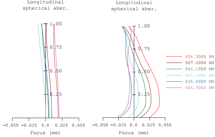 Fig.5显示,全球面Biogon镜头的球差校正效果更好. 一般来说,35mm格式镜头的非球面镜的使用非常仔细,因为这些直径的非球面镜成本很高. 例如,它们被专门引入靠近光瞳平面以校正主要球差[4]. 在 CCM 设计中,需要大量非球面来校正所有类型的像差.