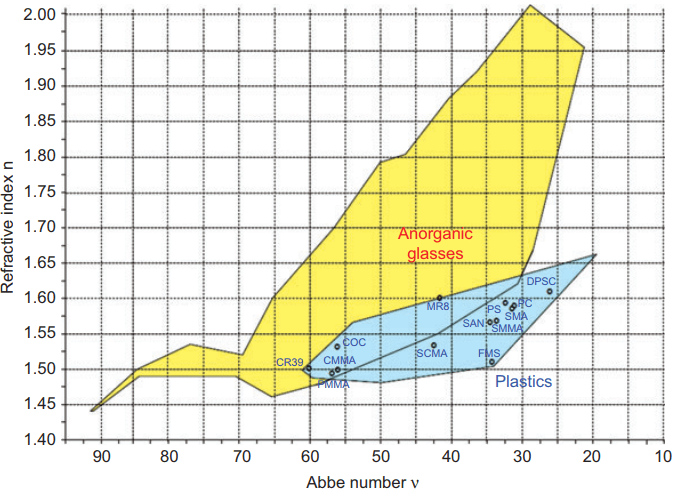 手机光学元件主要由注塑成型的塑料制成(见第3节). 大批量生产的塑料成本很低,并且可以生产具有强烈梯度的表面形状的镜片. 缺点包括透过率减少和强烈的环境依赖性[5]. 可用的塑料种类很少, 它们都位于阿贝图的右下角(Fig.6). 对于轴色的校正,使用阿贝数差异较大的材料来校正一次光谱, 使用部分色散相近的材料以减少二次光谱. 这两个要求都受到当前可用塑料的强烈限制.
