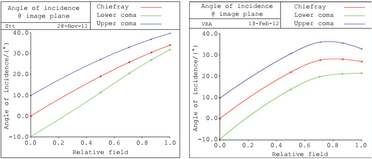 通常,CCM 设计中最靠近像平面的最后一片镜具有支持这种角度减小的特征形式(参见Fig.2和第 3 节). 在对角视场的最外侧部分,光线强烈地向z轴弯曲.在Fig.8中,可见CCM设计中的入射角从80%视场到100%视场,光线入射角减小. 相比之下,缩放的Biogon镜头显示出入射角随视场坐标的不断增加.