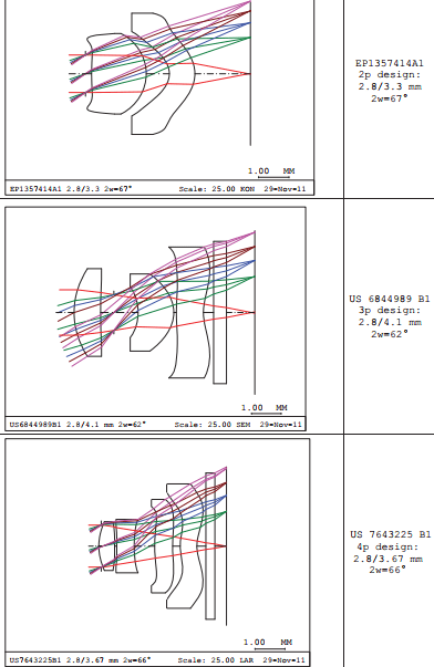 作为比较我们选择一个1g3p的具有理想光学特性的手机镜头设计(Fig.2右):f‘=4.52mm,F/#2.8,DFOV=2*w=2*38°